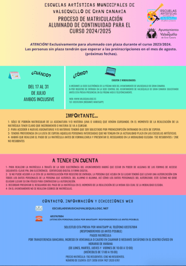 A principios de agosto será cuando se abra el plazo de preinscripción, esta vez, para todas las personas que quieran iniciarse en alguna de las disciplinas impartidas. La oferta formativa es amplia, por ejemplo, dentro del departamento de folclore existen especialidades de instrumentos y baile además, las clases también se imparten en los barrios del municipio. Asimismo, está el departamento de música, donde se imparten clases de canto, percusión, ukelele, violín, viola, violoncello, piano, guitarra clásica, y acompañamiento, trompeta, trompa y trombón, flauta, clarinete y saxofón entre otros; además existe la educación musical temprana para los más pequeños de la casa.