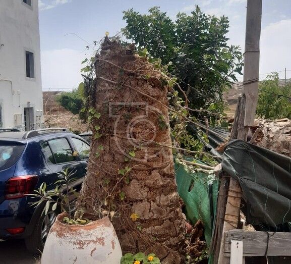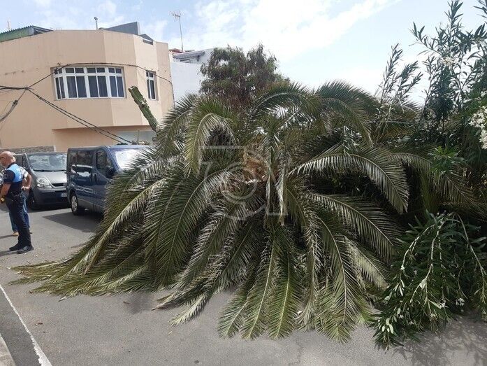 Una palmera canaria ubicada en la calle Simancas del barrio de Lomo Cementerio, en Telde, sufrió este mediodía la caída de su tronco superior y ramas. El incidente causó daños en el tendido eléctrico y en un vehículo estacionado en la zona.