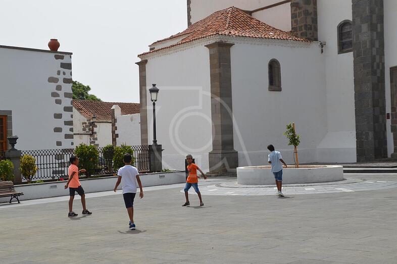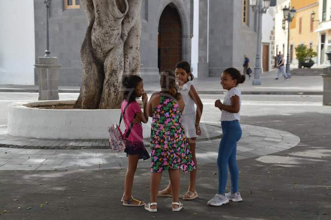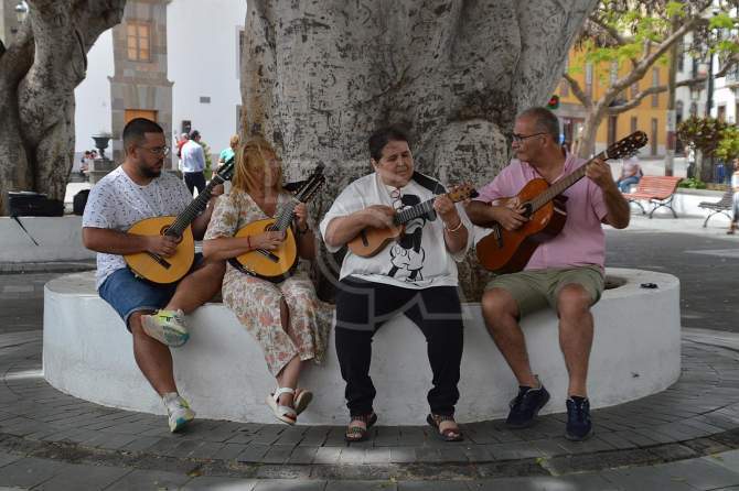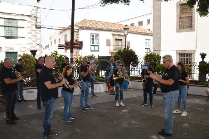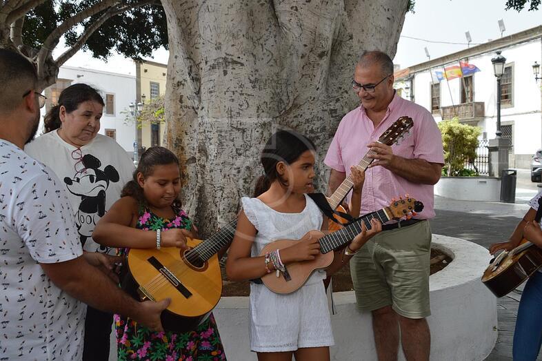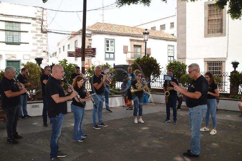 Pasodobles interpretados por la Banda Municipal de Telde y varias piezas de música popular canaria a cargo de monitores de la Escuela Municipal de Folclore, adscrita al área de Cultura le dieron la bienvenida en el recinto público del casco histórico de la ciudad bajo las copas de los viejos laureles de Indias para protegerse del sol y un calor sofocante suavizado por un ligero viento que se dejaba sentir en la zona.
