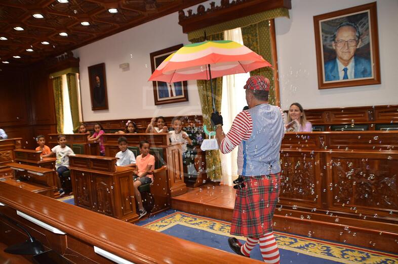 La ceremonia institucional de bienvenida se desarrolló minutos después en el salón de Plenos de las Casas Consistoriales, donde los niños tomaron asientos reservados para los concejales. Fueron sorprendidos con un espectáculo musical con pompas de jabón a cargo de Rafaelillo Clown que hizo las delicias de los pequeños procedentes de las polvorientes tierras de los campamentos de Tinduf (Argelia).