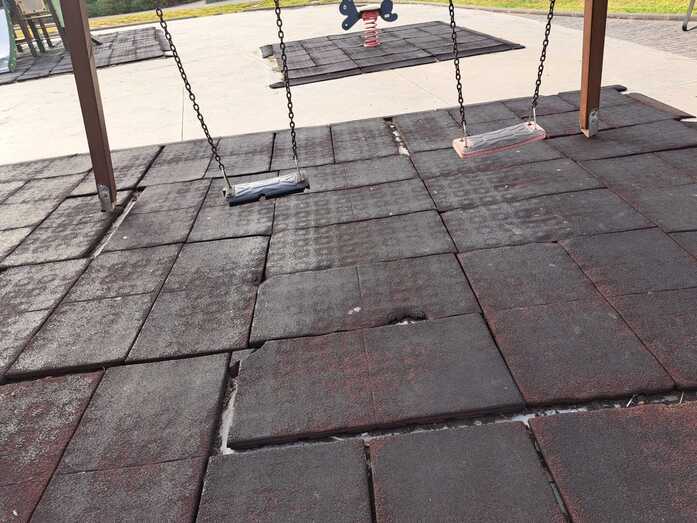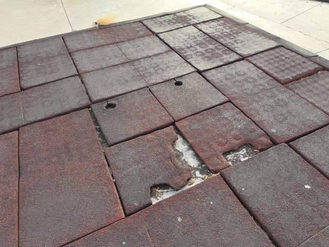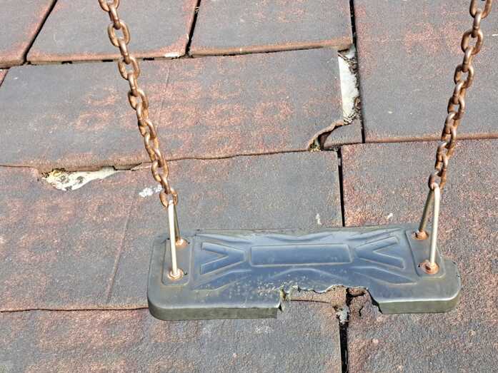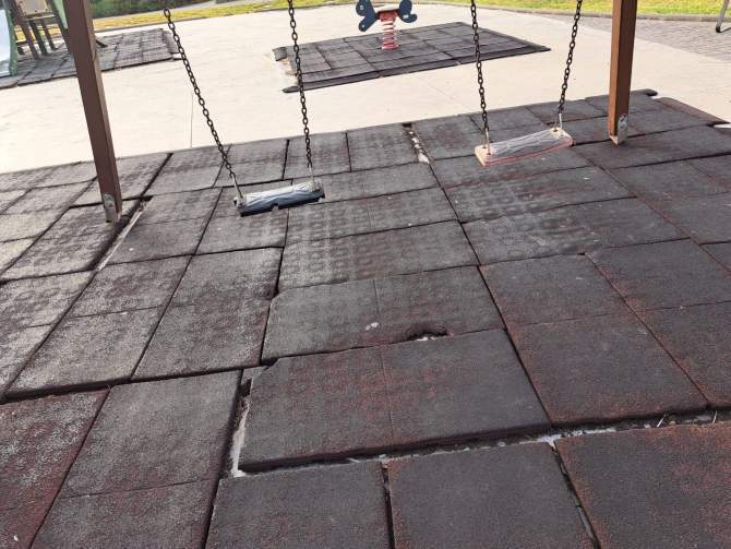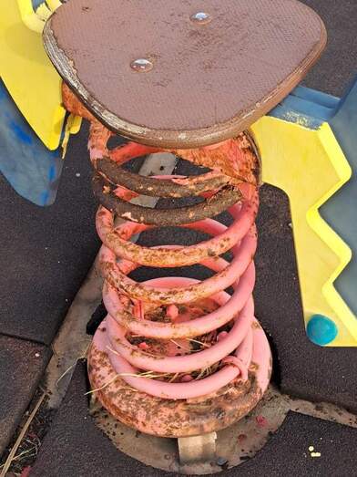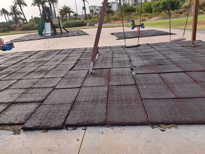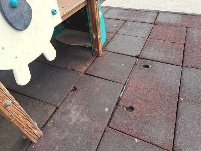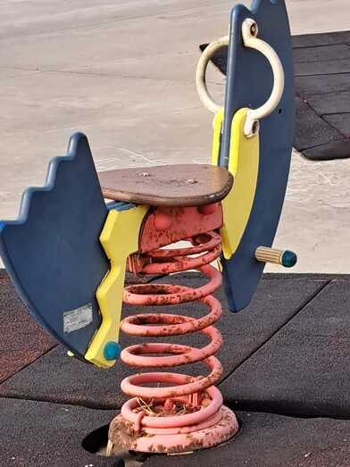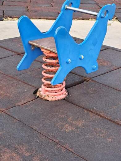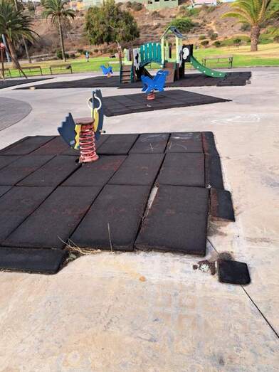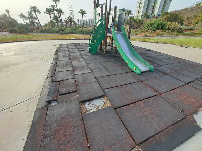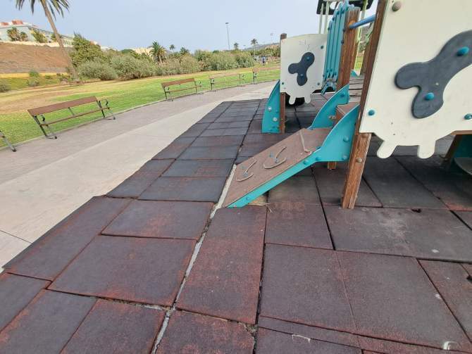 Advierten de la falta de papeleras y de los desperfectos de la zona infantil, con un pavimento en mal estado, tornillos al aire y otros elementos con óxido que pueden suponer un peligro para los pequeños.