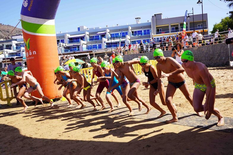 Precisamente, los más pequeños, un total de 40, fueron protagonistas en varios circuitos delimitados por boyas en la bahía de la playa de Mogán desde las 11:00 horas. Los niños y niñas participaron distribuidos por rango de edad. Los menores de la categoría prebenjamín –7 y 8 años– y de la categoría benjamín –9 y 10 años– compitieron en una distancia de 50 metros, mientras que los de 11 y 12 años de la categoría alevín lo hicieron en la de 100 metros y los de la categoría infantil –13 y 14 años – en la de 150 metros.