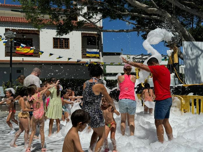 Niños y adultos de Lomo Magullo disfrutaron este domingo al mediodía de una refrescante y divertida Fiesta de la Espuma en la plaza de Las Nieves. Este evento, ideal para combatir el calor y pasar un rato lleno de risas y juegos, forma parte de las fiestas patronales de este populoso pago de las medianías de Telde.