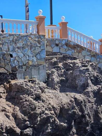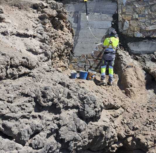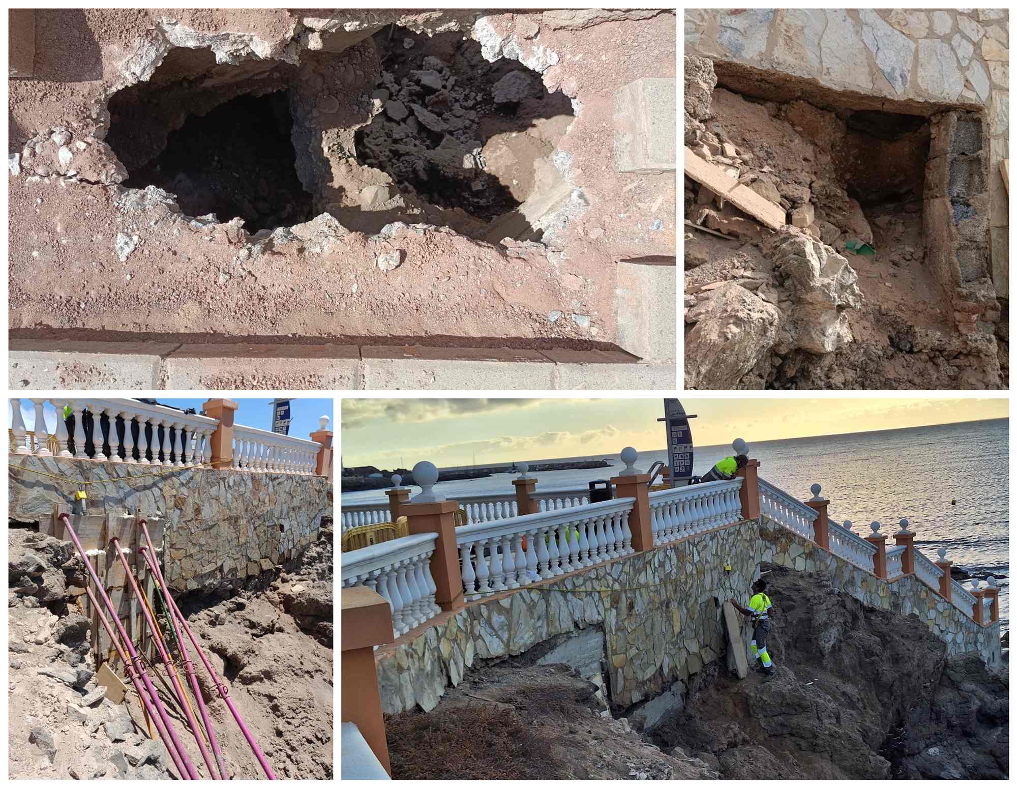 Los trabajos, autorizados por Demarcación de Costas en Canarias, están siendo ejecutados por operarios de la empresa Capross bajo la dirección del arquitecto Alberto González Monteverde y consisten básicamente en la colmatación del hueco y el reforzamiento de la talud del paseo costero que sufrió el desprendimiento de una gran roca desde una altura de cinco metros en agosto del pasado año y que llevó al departamento a tener que instalar un vallado preventivo en la zona siguiendo el consejo del técnico municipal que visitó el lugar del incidente.