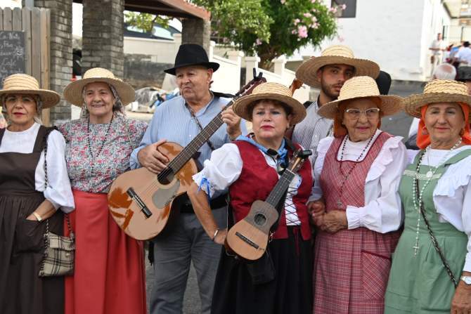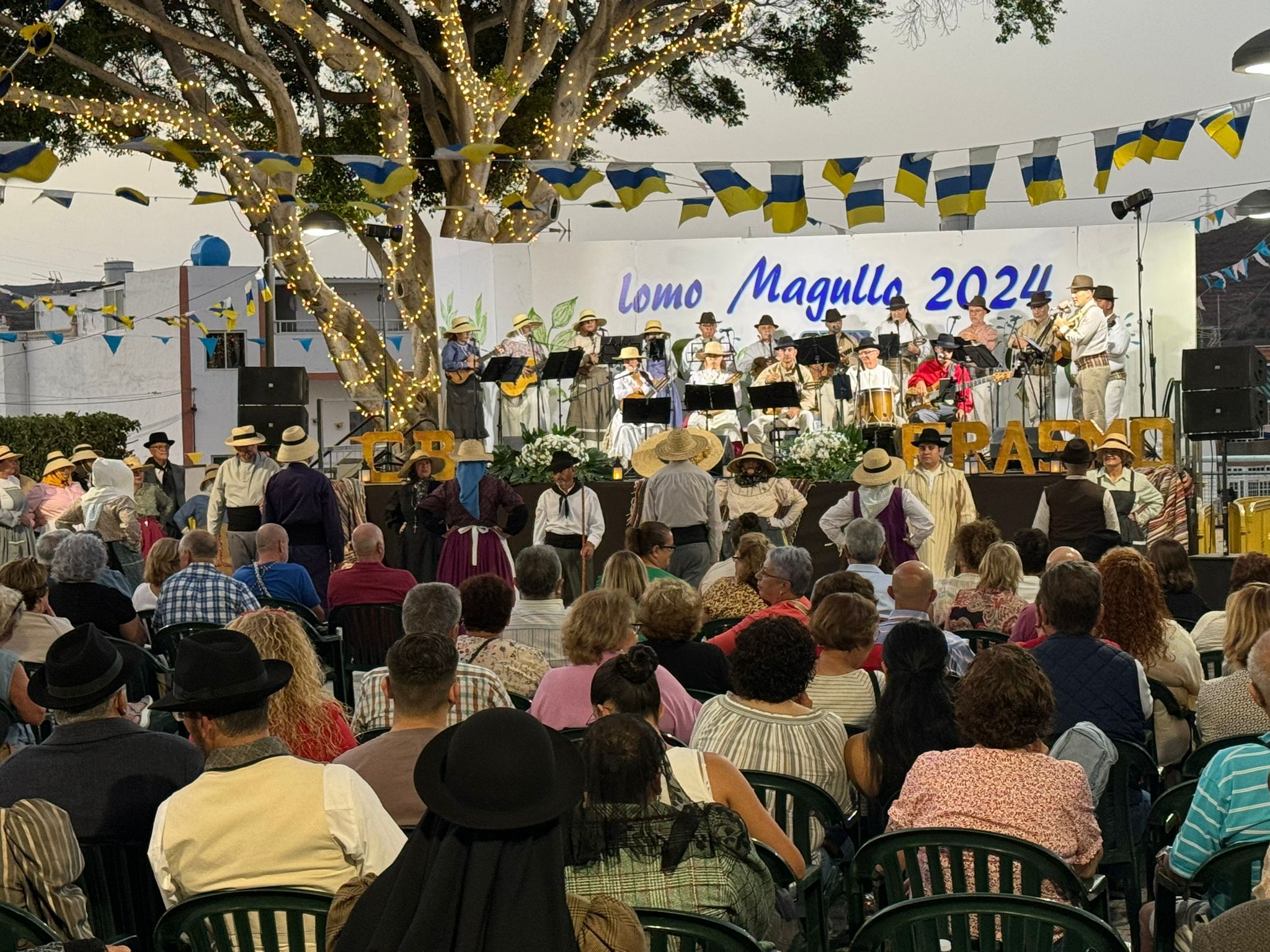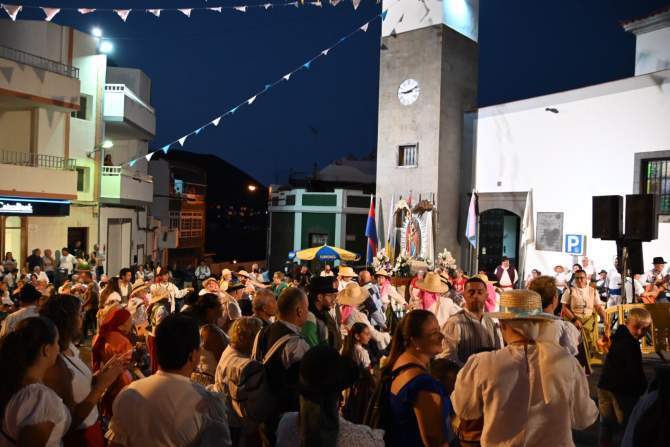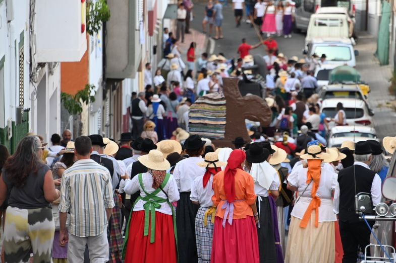 Este domingo, Lomo Magullo vivió una de las jornadas más destacadas de sus fiestas en honor a Nuestra Señora de Las Nieves con la celebración de la tradicional Romería Ofrenda. A partir de las 18:00 horas, los participantes, ataviados con trajes tradicionales, partieron desde la entrada al barrio de Los Arenales y llevaron sus ofrendas hacia el pórtico de la iglesia, donde se encuentra la imagen de la virgen.