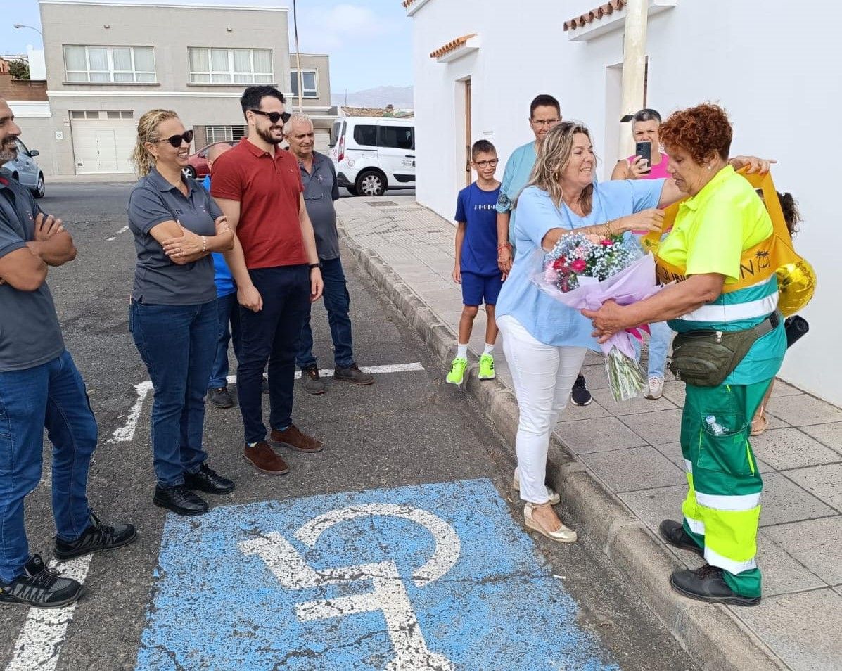 Hoy, en su último día de trabajo, Eduvigis Santana, una dedicada trabajadora del servicio de Limpieza Viaria del Ayuntamiento de Telde, que presta la UTE Telde, recibió una cálida sorpresa y un emotivo agradecimiento por parte de sus compañeros y de la concejala del área, María González Calderín, que le entregó un ramo de flores. Después de muchos años de servicio, Eduvigis se retira para disfrutar de una merecida jubilación.
