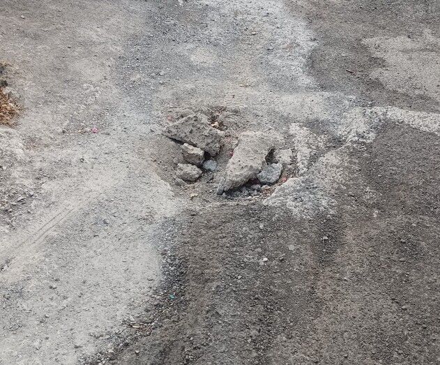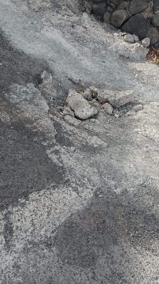 Asimismo, añaden que está en una cuesta y en una curva, y que para más inri tiene al descubierto una tubería de agua de abasto y un hierro clavado de punta, lo que podría ocasionar el reventón de un neumático.