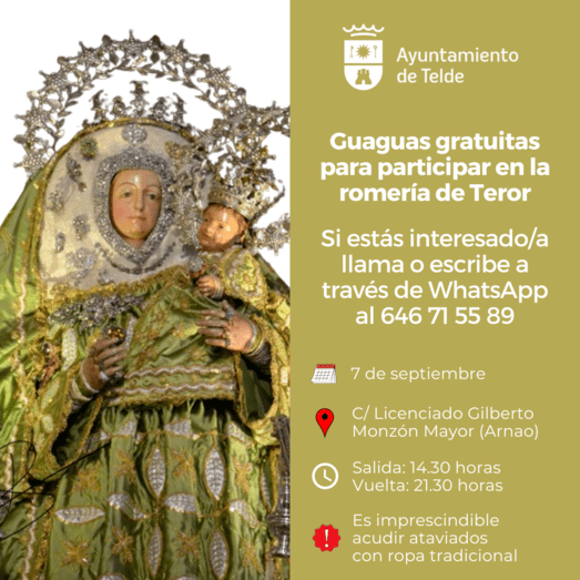 El Ayuntamiento de Telde, a través de la Concejalía de Festejos, que dirige Miguel Rodríguez, pondrá a disposición de la ciudadanía un servicio especial de guaguas para todas aquellas personas que quieran participar en la Romería de Teror, enmarcada dentro de las Fiestas Patronales de la Virgen del Pino, el próximo sábado 7 de septiembre.