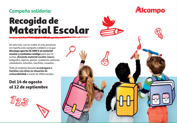 Los clientes que lo deseen podrán donar material escolar nuevo que Alcampo entregará a organizaciones locales del entorno de cada tienda participante para que, a su vez, se reparta a familias con niñas y niños en edad escolar en situación de vulnerabilidad.