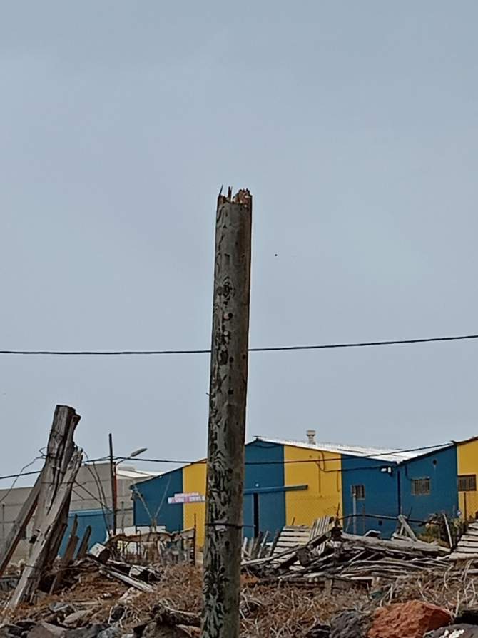 Además, otros dos postes han sufrido daños; uno fue partido por un coche en un accidente y otro está precariamente sostenido por una soga atada a un pino, lo que representa un peligro inminente para los vecinos que transitan por la zona, tanto en coche como a pie.