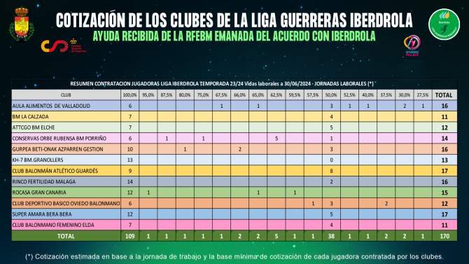 El reparto de esta cuantía se obtiene de los marcadores provenientes de la tipología de contratos y la cotización de cada club a la Seguridad Social, que en esta campaña ha experimentado un incremento sustancial, ya que el 64% de las jugadoras de la Liga Guerreras Iberdrola están cotizando sobre el 100%, y casi el 97% superan el 50% en su cotización, de hecho, solo el 4% están por debajo del umbral del 50%.