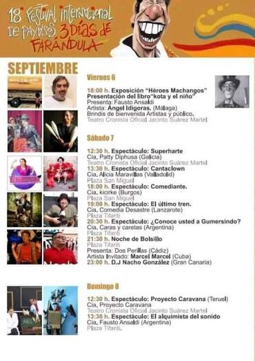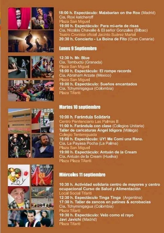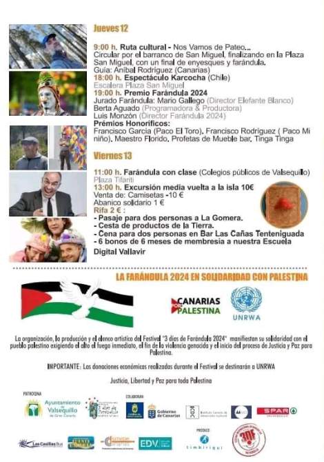 De un elenco de artistas de calidad que vienen de diferentes partes del mundo donde se va a respirar mucha alegría, muchas risas y muchas ganas de vivir; porque, ese es el final, como tu bien sabes que eres amante de la buena vida. La farándula son ganas de risas y alegría, tocayo. Vamos a poder disfrutar de unos buenos espectáculos de clown, unos conciertos, la presentación de un libro. Que la gente lea el programa, porque son más de 30 actividades en una semana para el disfrute de toda la familia y gratuito totalmente. Y, si me permites, también vamos a poder compartir un acto de solidaridad muy importante y necesario: la causa Palestina. Porque nos hacemos eco de las injusticias que se están produciendo en la franja de Gaza. Y tenemos que denunciar esta atrocidad, este genocidio.