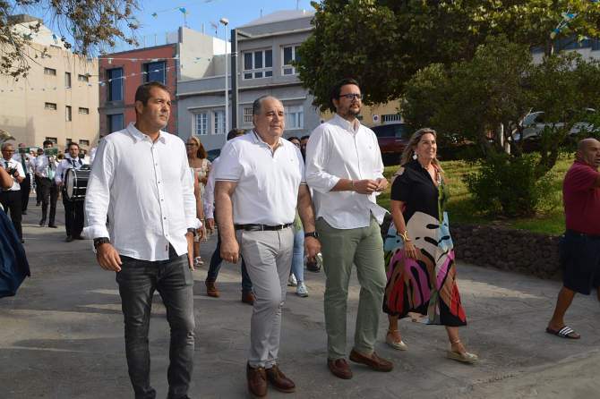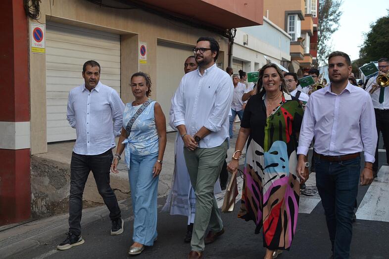 El evento inició pasadas las 18.00 horas, cuando los tronos de los patronos, portados a hombro por los vecinos de Melenara, salieron del templo de Clavellinas encabezados por el párroco Juan Manuel Zamora. A las puertas del templo, las imágenes fueron recibidas con fervor por la feligresía y una representación de las autoridades municipales, liderada por el vicealcalde Sergio Ramos y otros ediles del Gobierno de Telde, como Juan Martel, JUan Francisco Jiménez, María González Calderín, Iván Sánchez y Adela Álvarez. Cabe destacar la ausencia de representantes de la oposición en este acto.