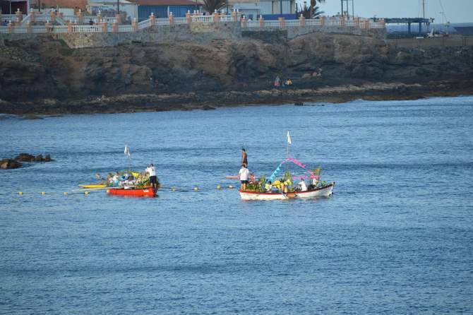 La procesión avanzó por la avenida de Melenara, donde fue recibida con descargas de voladores y vítores del público, hasta llegar a la playa. Allí, las tres imágenes sagradas fueron embarcadas en los barcos de pescadores -Mario Compaluna, Pino y José 1º- decorados con ramas de palmeras y coloridas banderolas. Durante más de 45 minutos, los barcos navegaron con las imágenes por el litoral de Melenara, Taliarte, Clavellinas y Salinetas, ante la atenta mirada de los fieles que seguían la travesía desde la orilla y paseo costero.