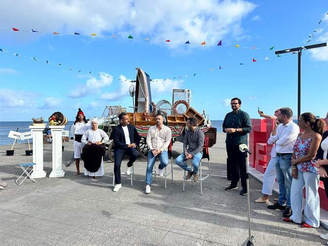 Así, durante la presentación esta tarde, dos modelos correctamente ataviados de marineras y marineros canarios acompañaron una muestra de fruta, verdura y pescado representativa de lo que se ofrendará a Nuestra Señora del Pino. Nauzet Afonso desveló el boceto de la carreta ante el público presente, que hasta ahora había sido un misterio.