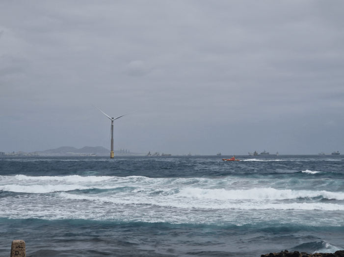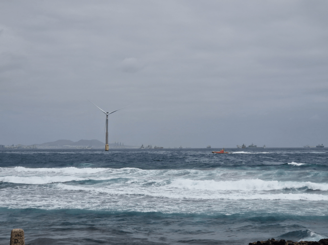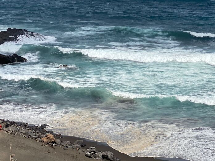 La mancha, que aún no ha tocado tierra pero que es bastante visible desde la costa, se extiende desde el aerogenerador marino de la Plocan (Plataforma Oceánica de Canarias) hasta la playa de La Restinga.