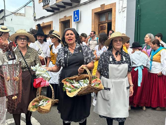 En su ofrenda a la Virgen del Pino, Telde aportó más de 550 kilos de alimentos, destacando 150 kilos de pescado fresco proveniente de la costa del municipio, además de 400 kilos de frutas y verduras. Durante el recorrido, la música folclórica estuvo a cargo del grupo Arnao, con el acompañamiento del cuerpo de baile Erasmo Hernández.