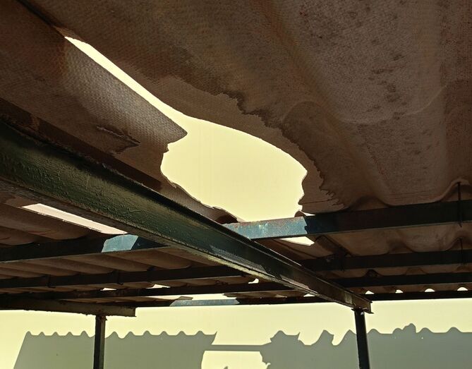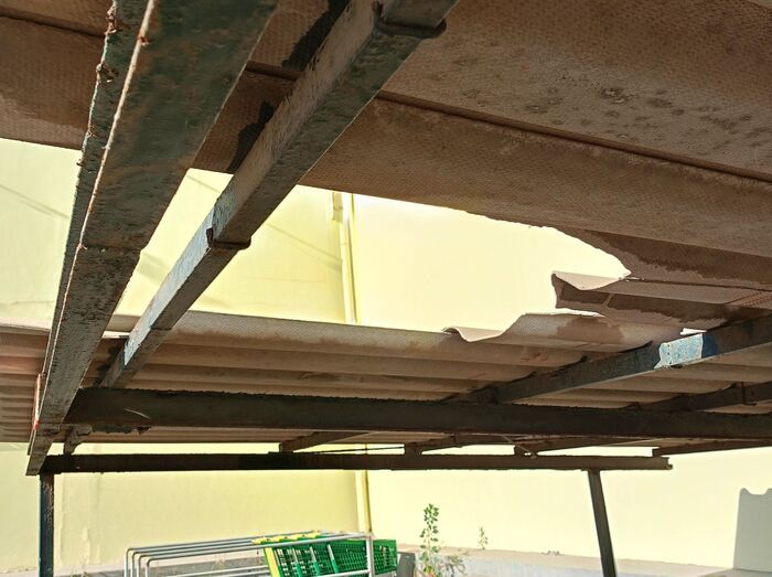 Los usuarios del supermercado HiperDino, próximo al Cruce de Melenara y colindante con la autovía GC-1 en dirección sur, han expresado su indignación ante el mal estado de los aparcamientos cubiertos del establecimiento. Según denuncian, las planchas de uralita que cubren parte de la zona de estacionamiento están rotas, lo que representa un peligro para los clientes debido a los riesgos asociados a este material, considerado potencialmente tóxico.