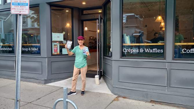 Me traje a la Little Crêpe Café de Cambridge una mascota, un canario de goma que presenté como mi "canario sin jaula", una metáfora de lo que deseo para todo el mundo: Libertad, Igualdad, Fraternidad. Me sentí protegido por Malcolm X, Martín Luther King...que aparecían en unos carteles detrás de mi amigo Alan y yo, la mejor compañía para contar tus buenas intenciones.