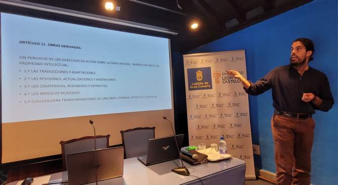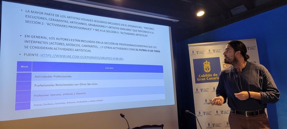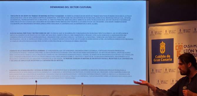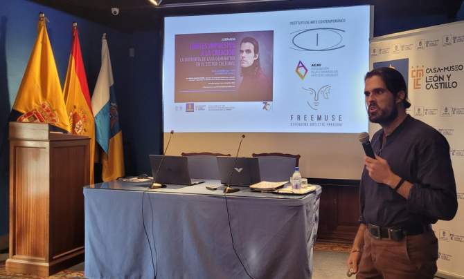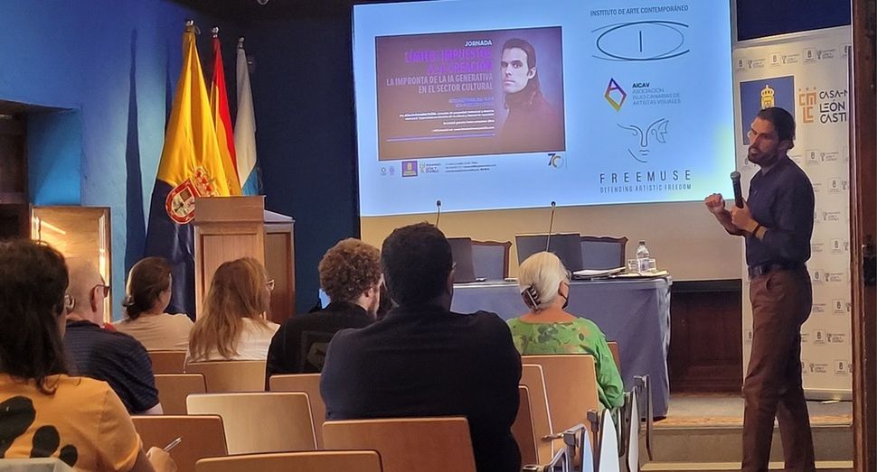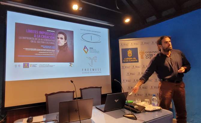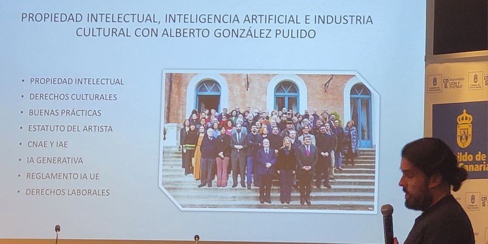 Alberto González Pulido ex asesor del grupo de trabajo de la Comisión Interministerial del Estatuto del Artista de España y miembro de la junta directiva de AICAV (Asociación Islas Canarias Artistas Visuales), como especialista en la materia impartió una magnífica ponencia sobre la situación a la que se enfrentan creadores y artistas y las posibles acciones e innovaciones legales ante la integración de la inteligencia artificial ordenada, garantista y respetuosa con los derechos fundamentales.