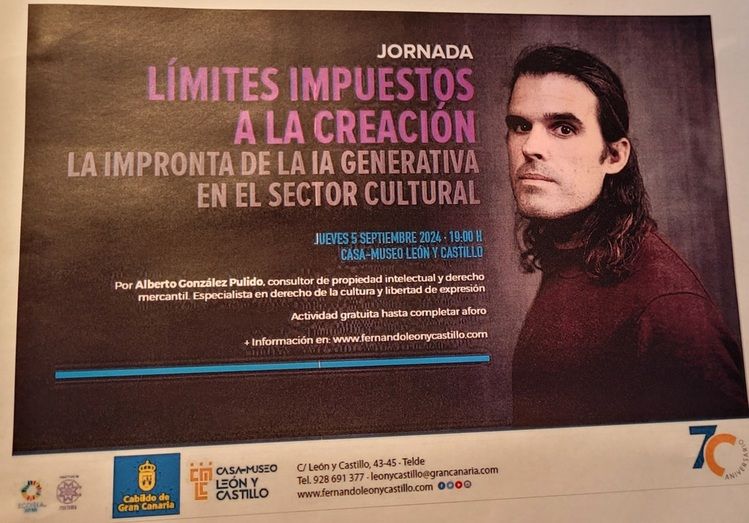 Después del paréntesis vacacional del verano 2024, regresan los programas culturales a la Casa Museo León y Castillo de Telde, con un primer acto presentado en la tarde del jueves 5 de septiembre, abordando los retos de la Inteligencia Artificial IA ante la cultura y su ordenamiento en la conferencia: Límites impuestos a la creación. La impronta de la IA generativa en el sector cultural. Interesante exposición impartida por Alberto González Pulido, consultor de propiedad intelectual y derecho mercantil, especialista en derecho de la cultura y libertad de expresión.