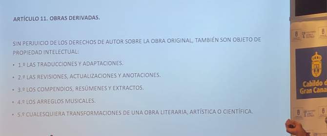 Con la proyección de textos que reflejan la actual aplicación y uso de las normativas que implican nuevas Creaciones y Prestaciones Protegibles, el analista aborda los diferentes campos conceptuales como la propiedad intelectual, derechos culturales, buenas prácticas, estatutos del artista, CNAE, IAC, inteligencia Artificial Generativa, reglamento de la IA en UE, derechos laborales. Derechos morales de la propiedad intelectual. Derechos Patrimoniales, modalidades de cesión de derechos de autor y derechos de participación.