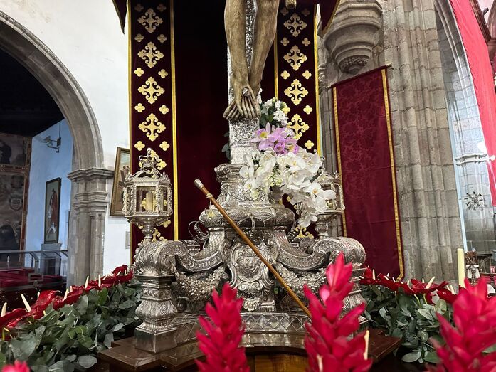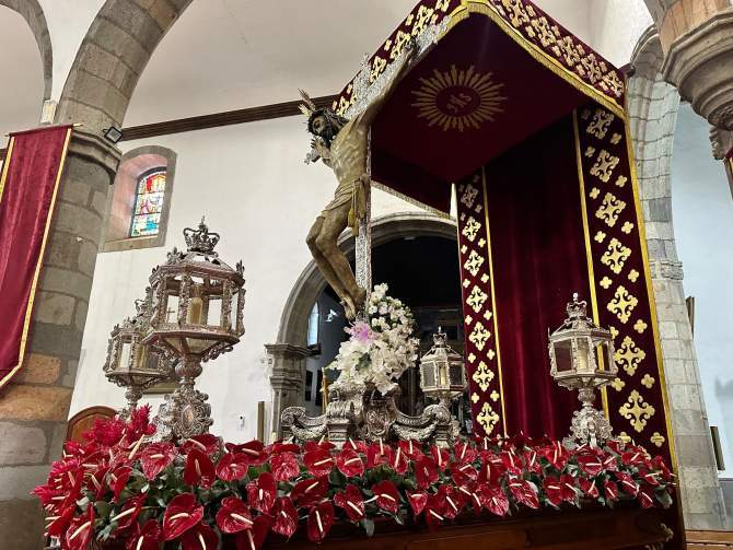 El desfile religioso tendrá lugar tras la solemne eucaristía de las 19.00 horas, que será oficiada por el obispo de la Diócesis de Canarias, José Mazuelos Pérez. El trono del Santo Cristo, bellamente adornado con anturios rojos, está preparado para recorrer las calles del casco histórico de San Juan, acompañado por autoridades, feligreses y la Banda Municipal de Música de Telde.