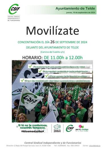 La Central Sindical Independiente y de Funcionarios (CSIF) convoca una concentración el próximo 26 de septiembre, de 11.00 a 12.00 horas, a las puertas de la sede del Ayuntamiento de Telde para reclamar que los trabajadores municipales recuperen los derechos laborales que han visto desaparecer en los últimos años.