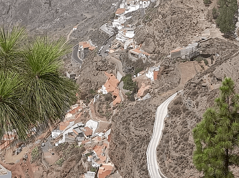 Continuamos el periplo hasta asomarnos a Artenara. Es muy bello descubrir el pueblo a medida que nos vamos aproximando. Una línea de casas albeadas con terrazas planas impermeabilizadas con pintura roja o naranja, algunas con tejados a dos o cuatro aguas con teja de similar color, serpentea siguiendo el trazado del risco. Es por los riscos de esta montaña conocida como El Toril, por donde accedemos a la senda en la piedra que nos conduce, sin desvío alguno a otra cueva, la cueva que alberga la Virgen de la Cuevita. La gruta, austera y bella, presenta esculpidas en la misma roca, altar, confesionario, pulpito y coro.