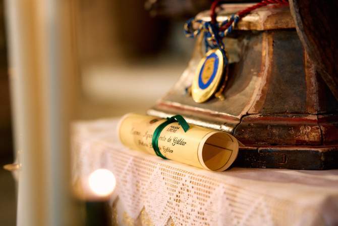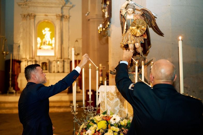 La festividad había arrancado en el Santuario de Santiago con la Eucaristía, tras la que se llevó a cabo la lectura del voto del Capitán Esteban Ruiz de Quesada que, según la historia, decía que “deberán los Patronos poner doce velas de a libra en el trono del Arcángel y seis del mismo peso en el Altar mayor y dos codales de a media libra cada uno, quedando asimismo de su cuenta y cargo enramar la iglesia de junco rama”.