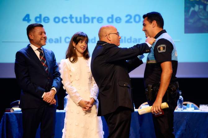 A continuación recibieron la medalla de plata al mérito profesional Clase A al subinspector Jefe de la Policía Local José Francisco Quesada Medina y al Subinspector Juan Manuel Sosa Santana. Sobre ellos, Teodoro Sosa detalló que “han sido la cara de la Policía Local de Gáldar durante muchos años”. “Han sido distinguidos por su colaboración en la Operación Dargal pero especialmente por el trabajo y la dedicación de tantos años. Han estado siempre al lado de la ciudadanía y cumpliendo su obligación con honor. Ustedes han dejado siempre el nombre de la Policía Local en un lugar muy alto. Muchas gracias en el nombre de este Ayuntamiento, en el mío como alcalde y en el de mis compañeros de la corporación municipal”, agregó.
