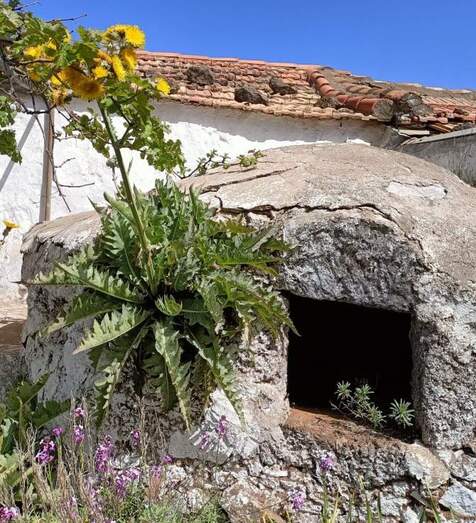 Mientras Abel Galindo nos habla de tan interesante referente etnográfico, observo una decena de mariposas de la col libando en las enormes flores de lirios blancos (Iris albicans), completamente asilvestrados. Es innegable que este lugar, cuando no se trata de sobrevivir por necesidad, visto desde nuestro prisma actual, es un lugar paradisíaco. Se incide en las preguntas y explicaciones en las tareas diarias y la vida en estas casas. Todo es pasado.