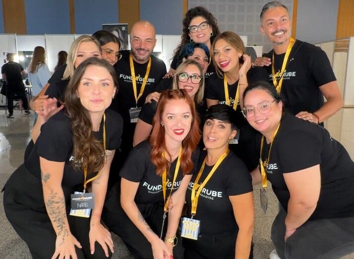 El equipo de maquilladores de Fund Grube para Moda Cálida estuvo compuesto por un grupo de profesionales de gran talento, entre los que se incluyeron nombres como Laura Hernández, Ruyman Hernández, Yamila Valeria Ten Godoy, Irena San Gil, Leonor Martel, Rocio Diloreto, y muchos otros destacados en el mundo del maquillaje profesional.