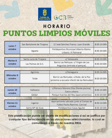 La Concejalía de Limpieza Viaria y Recogida de Residuos, que dirige María Calderín, instalará este miércoles 9 de octubre, de 8.00 a 20.00 horas, el punto limpio itinerante del Cabildo de Gran Canaria en la Avenida de La Paz -trasera del IES Profesor Antonio Cabrera Pérez-, en el barrio de Las Remudas.