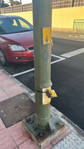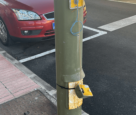 Preocupación por el riesgo de unos cables que cuelgan de la botonera de un semáforo ubicado en un paso de peatones en La Pardilla, frente al instituto Guillermina Brito.