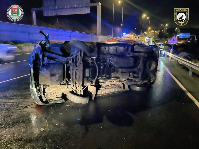 Un accidente de tráfico ocurrido de madrugada en la GC-1, a la altura del Centro Comercial El Mirador, dejó a dos personas atrapadas en sus vehículos. El siniestro ocurrió en dirección hacia la capital entre dos vehículos, con vuelco de uno de ellos.