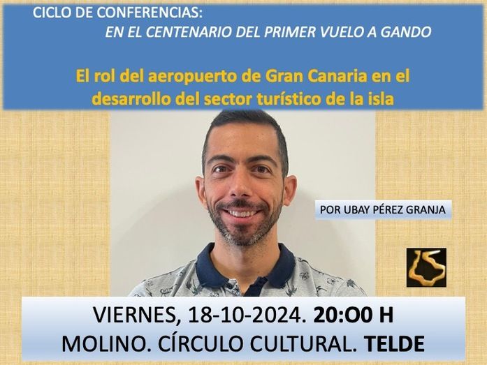 El Círculo Cultural de Telde acoge este viernes, día 18 de octubre, una charla a cargo Ubay Pérez Granja sobre el rol que ha desempeñado el Aeropuerto de Gran Canaria en el desarrollo del sector turístico de la Isla. Será a partir de las 20.00 horas en el antiguo Molino del Conde.