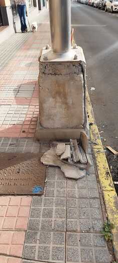 Al pasar hoy en coche, entorno a las 9:30 -ó 10 aproximadamente lo observé . Di una vuelta en los alrededores de la zona y mercado, para ver si había un policía local y hacérselo saber, porq la farola está a punto de caerse y como no vi ninguno. Paré cuando pude y lo denuncié vía teléfono a la policía local. Ellos están avisados y advertidos del peligro del estado de esa farola. Espero que por la seguridad ciudadana actúen en consecuencia. Gracias.