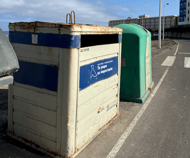 Vecinos de Playa del Hombre advierten de un contenedor de papel y cartón ubicado en la calle Rafael Monzón Grau Bassas, en las inmediaciones de la Residencia de Taliarte, que se encuentra en mal estado.