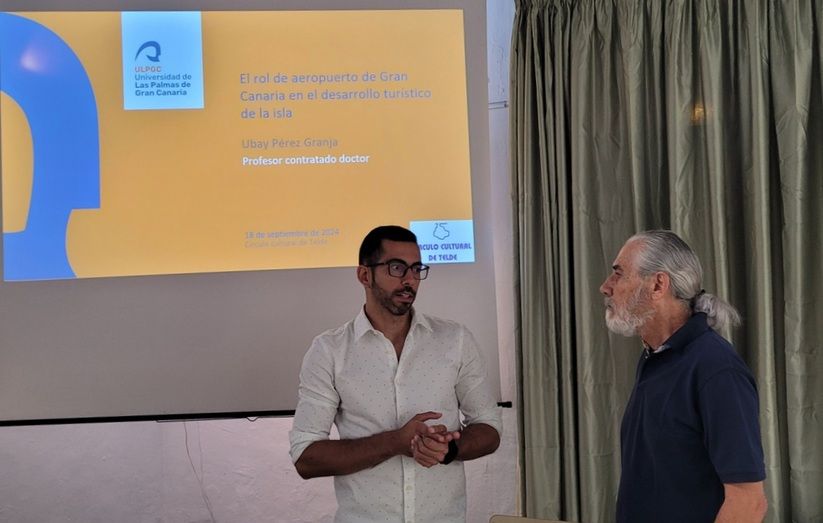 Enmarcada en el ciclo de conferencias organizadas por el Círculo Cultural de Telde que dirige Máximo Riol Cimas, en colaboración con la Facultad de Economía, Empresa y Turismo de la Universidad de Las Palmas de Gran Canaria (ULPGC), y con motivo del Centenario del primer aterrizaje en el páramo de Gando, en una segunda sesión de este ciclo, el viernes 18 de octubre se impartió la conferencia El rol del Aeropuerto de Gran Canaria en el desarrollo del sector turístico de la isla, ponencia expuesta por el doctor, Ubay Pérez Granja, Master en Economía del Turismo, el Transporte y el Medio Ambiente por la ULPGC y profesor contratado en el Departamento de Economía Aplicada, miembro del Grupo de Investigación en Economía de las Infraestructuras, Transporte y Turismo (EITT).