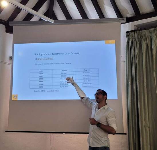 Tras estas primeras exposiciones Ubay Pérez dedica unos análisis estadísticos fuente ISTAC, de 2023 partiendo de 1955 comparativo y en referencia al número de turistas en Canarias y Gran Canaria, así como por nacionalidades destacando los extranjeros procedentes de Reino Unido, Alemania y Países Nórdicos que superan al total de Península y gasto turístico, por turista y día, y por estacionalidad Canarias y oros destinos de sol y playa (2004-2007).