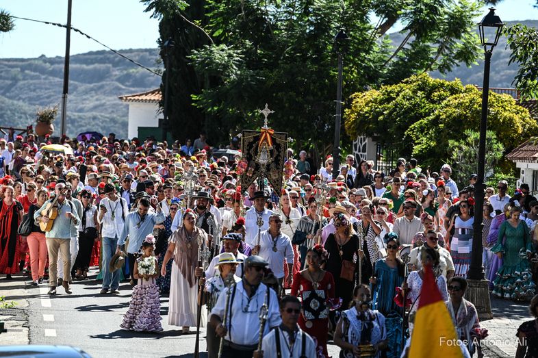 Teror vivió este domingo la tradicional Romería-Peregrinación de la Real Hermandad de Nuestra Señora del Rocío de Las Palmas de Gran Canaria, con una multitudinaria afluencia de peregrinos que acompañó al ‘Bendito Simpecado’, que este año llevo portado sin carreta, y asistió a la misa rociera en la Basílica.