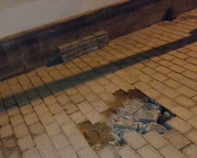 Las obras de reparación de una avería en la red de abasto en la vía de servicio bajo el paseo del parque urbano de San Juan, en su lado naciente, han dejado adoquines sueltos y otros amontonados que, supuestamente, serían para el arreglo del hueco dejado por los trabajos acometidos.