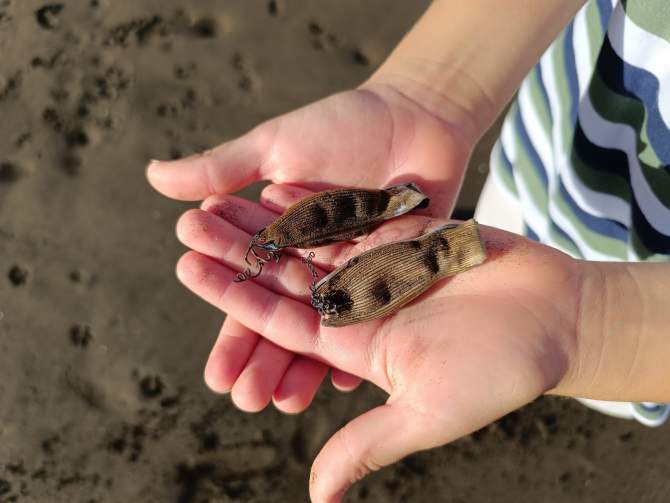 Hubo más curiosidades, como un alevín de pez piloto o una medusa botón azul que habían sido arrastrados por la marea. Pero sin duda, la sorpresa vino al descubrir los huevos de tiburón. Jon sabía reconocerlos porque ya los había encontrado antes en playas del Cantábrico. Los huevos eran del tamaño de un dedo, con hilos en uno de sus extremos para quedar anclados al fondo y distintos a los que había visto hasta ahora, por sus estrías y su tacto aterciopelado. Sus padres, oceanógrafos y autores de la Guía de Biodiversidad Marina de Canarias, nunca antes habían visto esos huevos de tiburón.