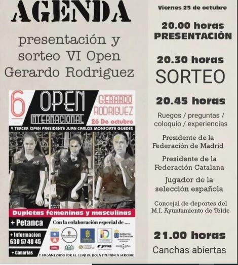 Las pistas de atletismo del complejo deportivo de El Hornillo acogerán este sábado, a partir de las 8.30 horas, la VI edición del Open Internacional de Petanca Gerardo Rodríguez. Una cita deportiva en la que participarán 54 equipos masculinos y 32 femeninos que buscarán auparse con el triunfo en las 43 canchas de petanca preparadas para este evento, organizado por el Club de Bola Canaria y Petanca Gerardo Rodríguez, contando con la colaboración de la Concejalía de Actividad Física y Deportes del Ayuntamiento de Telde, que rige Cristhian Santana Caballero, que ha mostrado su total predisposición para la celebración de un torneo de estas características.