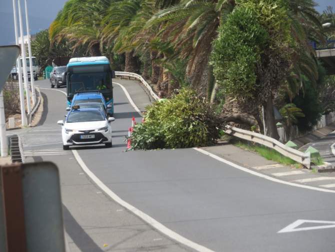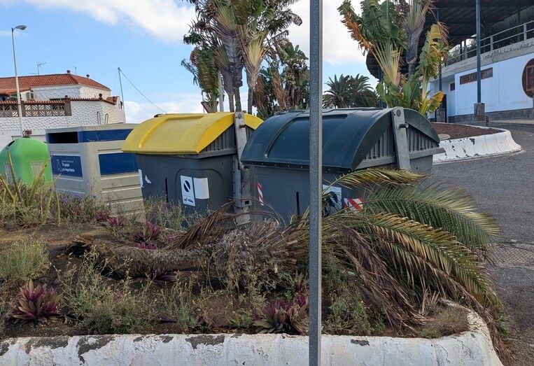 Las recientes lluvias y rachas de viento que han afectado a Telde han provocado la caída de una pequeña palmera en un parterre ajardinado junto a los contenedores de basura que se encuentran en la entrada del cementerio de San Juan, frente a la Floristería Siempreviva.