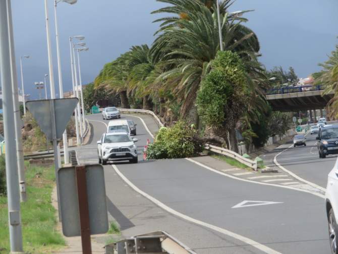 El arbusto, que se desplomó sobre el asfalto unos metros antes del ceda al paso en la incorporación a la GC-10, invadió parte del carril, que tuvo que ser balizado. Fue retirado por personal de Parques y Jardines.