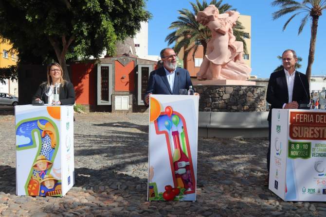 En la mañana de este miércoles, 30 de octubre, la Mancomunidad del Sureste de Gran Canaria ha presentado la XXI edición de la Feria del Sureste. Este evento es ya un encuentro consolidado para promocionar la riqueza agroalimentaria y artesanal de la Comarca que, como cada año, es todo un éxito, y que se celebrará los días 8, 9 y 10 de noviembre en la Avenida de Canarias, en Vecindario. En el acto han estado presente el presidente de la Mancomunidad y alcalde de Santa Lucía de Tirajana, Francisco García, la vicepresidenta primera y alcaldesa del Ayuntamiento de Ingenio, Vanesa Martín, y el vicepresidente segundo y alcalde del Ayuntamiento de Agüimes, Óscar Hernández.