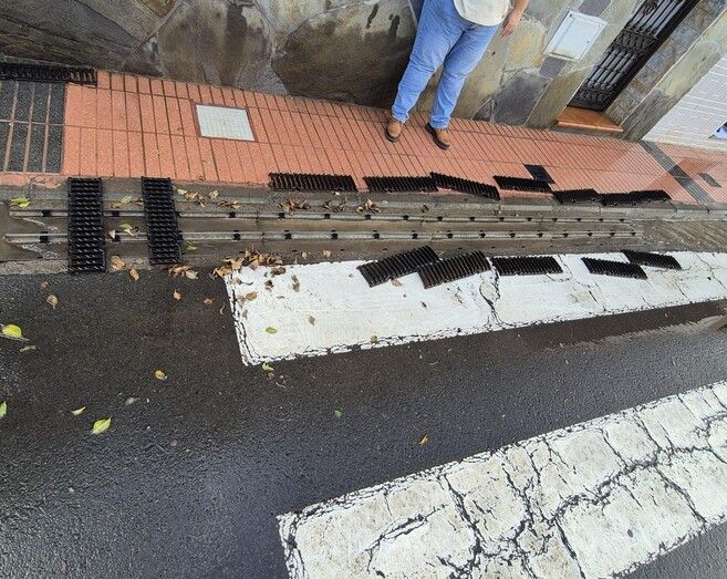 Las rejillas de una toma de aguas pluviales, ubicadas estratégicamente frente al colegio CEIP Los Caserones y delante de domicilios particulares, se han convertido en el epicentro de una serie de desventuras acuáticas.