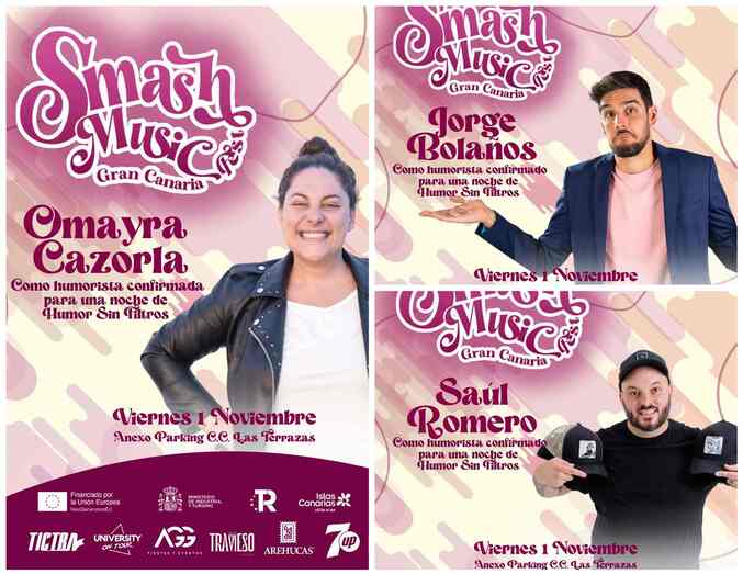 El espectáculo Humor Sin Filtros llenó de carcajadas el Smash Music Fest ayer viernes en los aparcamientos del Centro Comercial Las Terrazas, en Telde. Omayra Cazorla, Jorge Bolaños y Saúl Romero hicieron reír a los asistentes con su estilo único y humor auténtico.